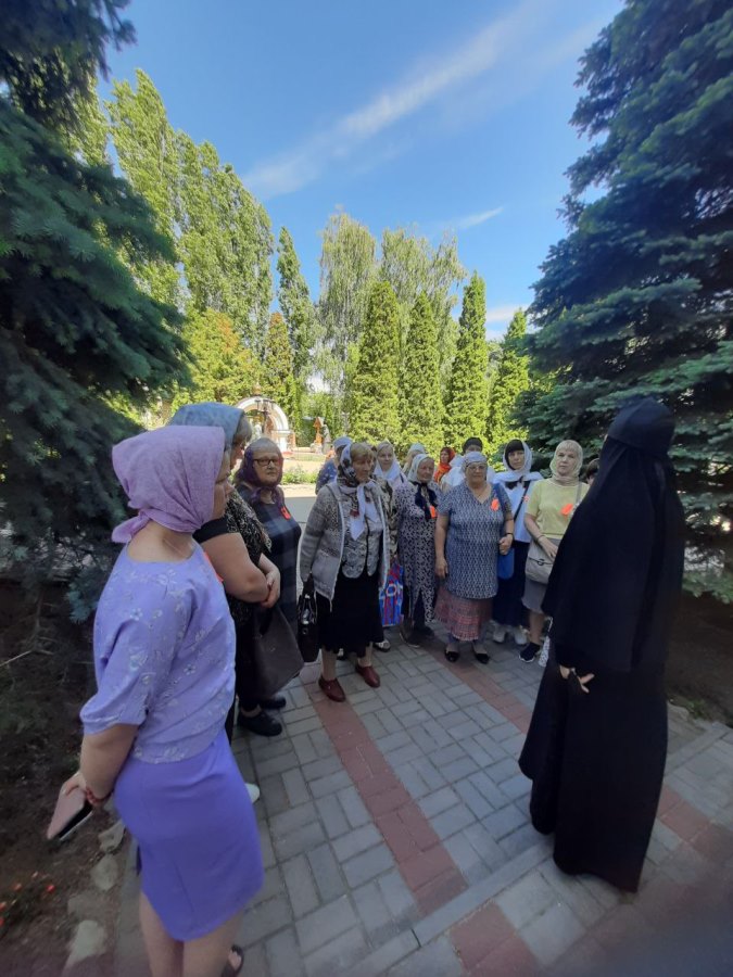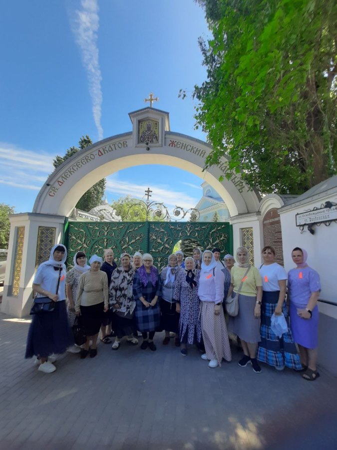 В Алексеево - Акатовом женском монастыре познакомились с историей монастыря, посетили храмы, приложились к чудотворным иконам. Во время экскурсии по территории обители паломники осмотрели монастырские постройки, полюбовались цветами на клумбах, узнали историю появления пары лебедей, которые обитают в маленьком прудике. Инокиня София, которая проводила экскурсию, рассказала о матушке блаженной Феоктисте, о ее многотрудном жизненном пути, преисполненном страданий, скорбей и радостей о Господе. Матушка София рассказала и том, как в настоящее время проходит жизнь в монастыре.