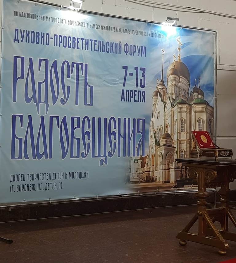 С 7 по 13 апреля в Воронеже проводится Духовно - просветительский форум "Радость Благовещения". По благословению митрополита Воронежского и Лискинского Леонтия на форуме пребывает частица Ризы Пресвятой Богородицы. Также в фойе Дворца творчества детей и молодёжи где проводится форум, проходит выставка - ярмарка от более 70 храмов и монастырей Воронежской области, других регионов России, ближнего и дальнего зарубежья.