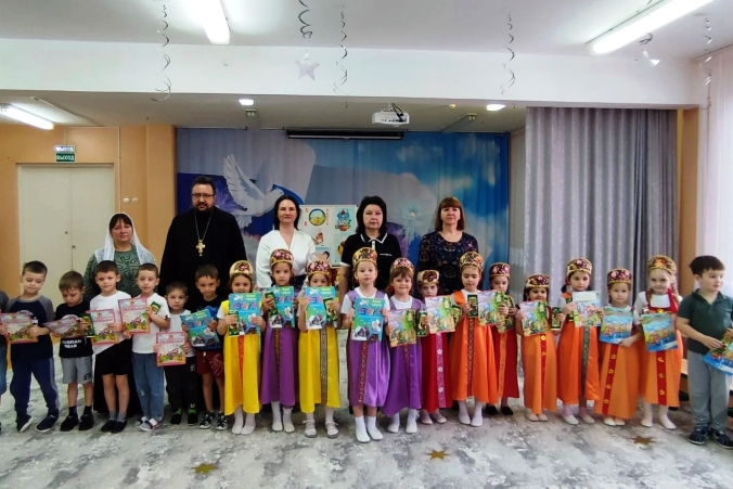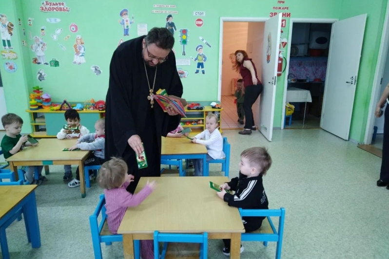 Особое внимание гости уделили малышам из ясельных групп. Батюшка и матушка посетили две ясельные группы, поздравили крох с Пасхой и вручили им шоколадки. Православные книжки были переданы воспитательницам — чтобы они могли читать их детям, знакомя малышей с духовными ценностями с самого раннего возраста.