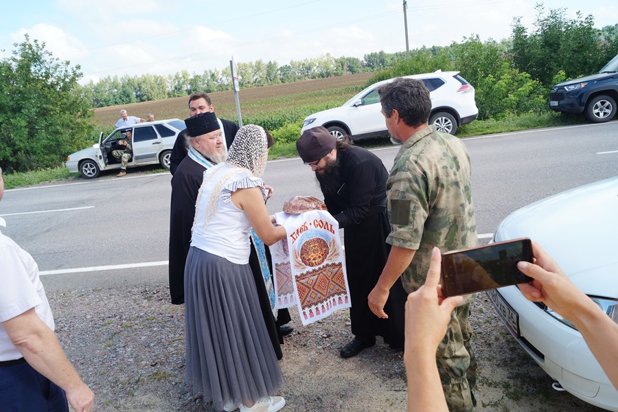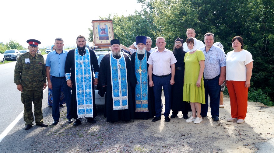 В 9.00 святыню встречали на границе Калачеевского и Верхнемамонского районов глава Верхнемамонского муниципального района Михайлусов Олег Алексеевич, заместитель главы района Бухтояров Сергей Иванович, экс-глава района Быков Николай Иванович и помощник благочинного Богучарского церковного округа в Верхнемамонском районе настоятель Свято-Митрофановского храма протоиерей Сергий Чибисов.