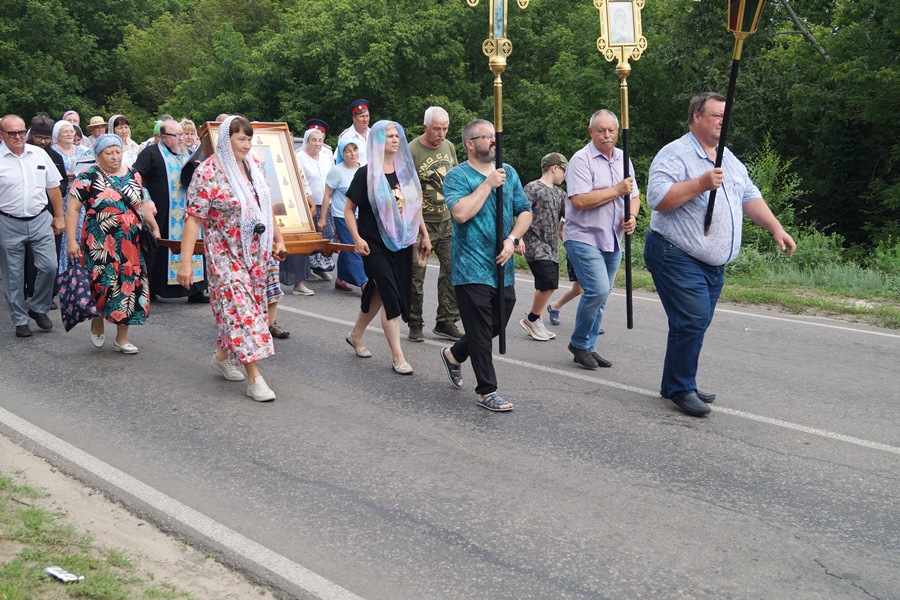 Далее состоялось шествие Ильинского казачьего крестного хода с иконой Пресвятой Богородицы от Верхнемамонского хлебоприёмного предприятия до Свято-Митрофановского храма. Каждый участник крестного хода смог пронести икону Царицы Небесной. Под звон колоколов святыню с молебным пением пронесли вокруг храма и в торжественной обстановке в храме был совершен молебен с акафистом. Собравшиеся прихожане смогли приложиться к иконе Богородицы, испросив у нее помощи Божией в своих житейских делах и нуждах.