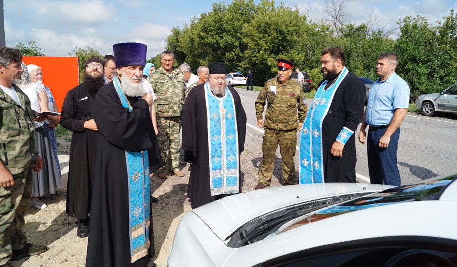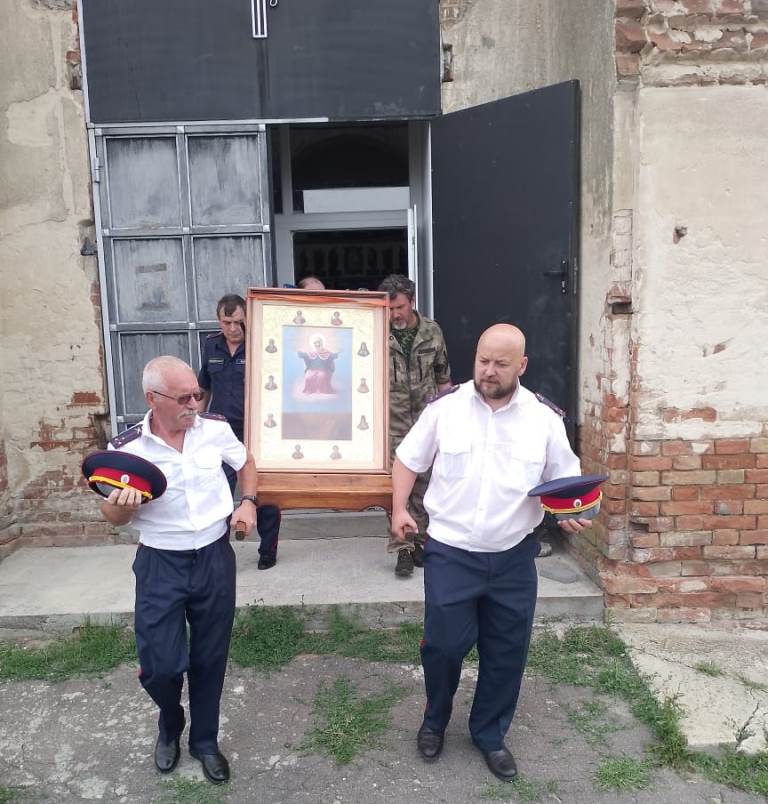 Икону доставили настоятель храма Преображения Господня села Заброды протоиерей Евгений Сорокин, настоятель храма в честь вмч. и целителя Пантелеймона села Пришиб иерей Евгений Чорноус, иеродиакон Захария и представители казачества.