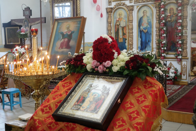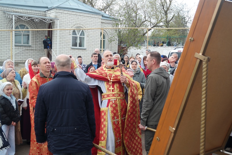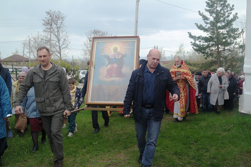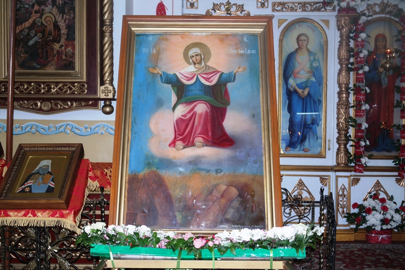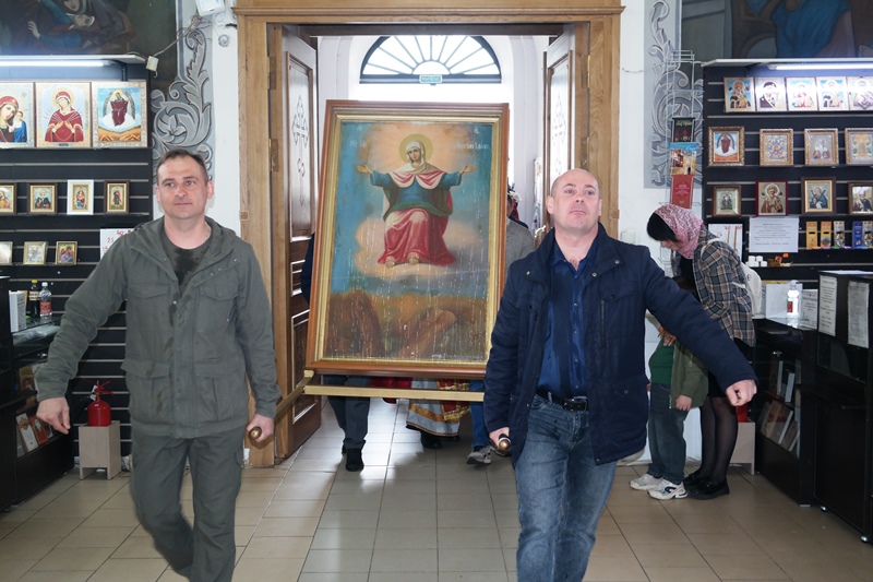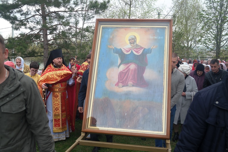 По отпусте Литургии духовенство и миряне прошли крестным ходом вокруг храма под торжественный звон колоколов, неся святой образ иконы Божией Матери «Спорительница хлебов».