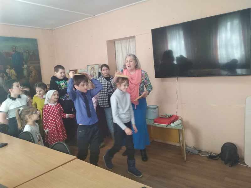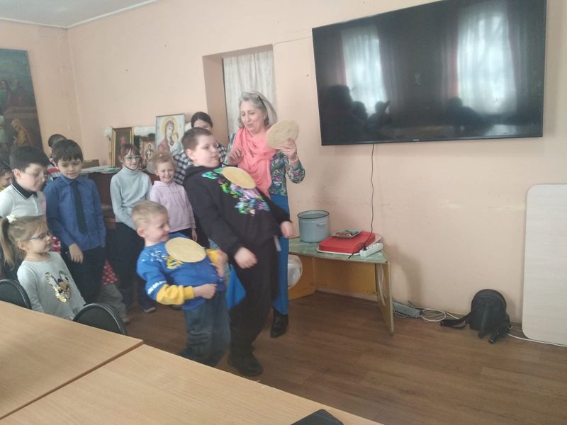 Затем педагоги воскресной школы Татьяна Ивановна Котомина и Алевтина Михайловна Шабаева провели для детей викторину «По страницам православных книг». Далее дети исполнили песню и под руководством педагога Олеси Петровны Кравченко поиграли в эстафету «Веселая масленица». Закончился праздник чаепитием.