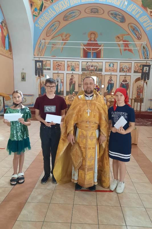 По окончании молебнов священнослужитель окропил всех присутствующих святой водой и обратился к учащим и учащимся, а также их родителям с проповедью. Затем иерей Алексий вручил детям из многодетных семей подарочные наборы к школе в виде канцелярских предметов и денежных средств, собранные в рамках акции «Собери ребёнка в школу».