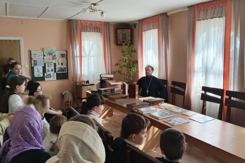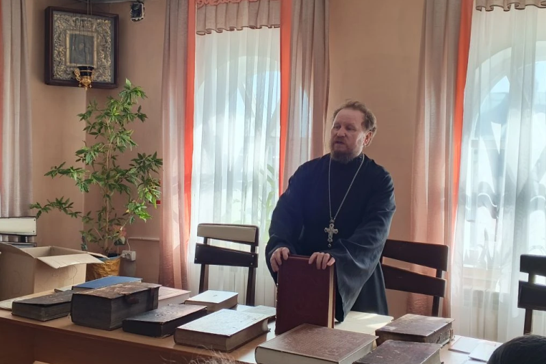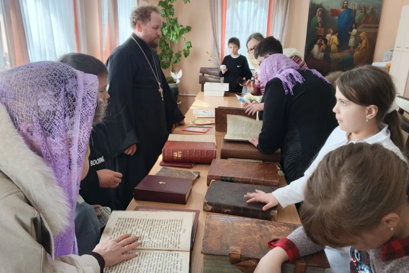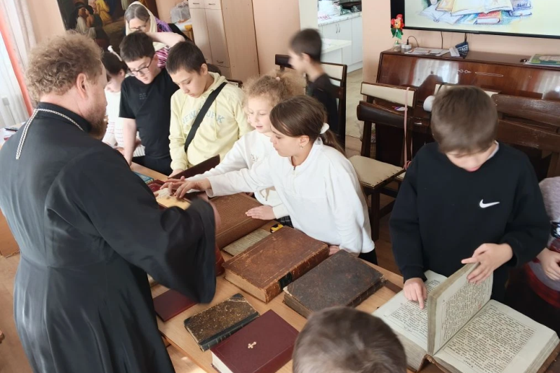 В классе были выставлены книги, используемые во время богослужения. Ребята смогли вблизи увидеть богослужебные книги, такие как Евангелие, Апостол, Псалтирь, возраст которых более 300 лет.