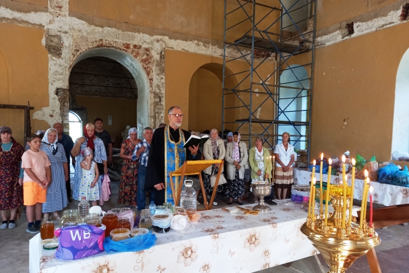 Богослужение возглавил настоятель храма, иерей Евгений Чайкин. В ходе священнодействия священнослужитель совершил освящение воды и меда.