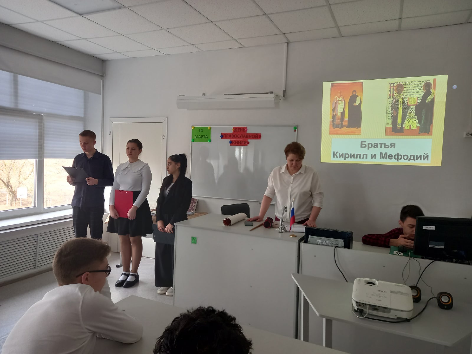 На открытом уроке, который проводила учитель русского языка и литературы Лукьянчикова Марина Васильевна, присутствовали учащиеся 8-х и 9-х классов. Ребята послушали историю о возникновении праздника, об Иване Федорове и Петре Мстиславце, стоявших у истоков книгопечатания на Руси.