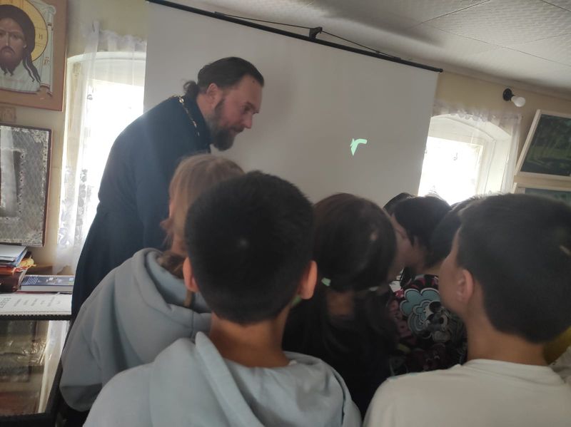Отец Виталий рассказал ребятам, что в современном мире носителей информации множество, но ничто не может сравниться с книгой. Он особо подчеркнул важность православной книги и показал Евангелие.