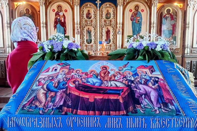 По возвращении в храм было пропето величание празднику Успения Пресвятой Владычицы нашей Богородицы и Приснодевы Марии и возглашено уставное многолетие Святейшему Патриарху, Правящему Архиерею, богохранимой стране нашей и всем православным христианам.