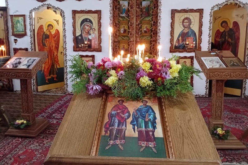 После чего духовенство и миряне вознесли молитву перед чтимой иконой святых бессребреников Космы и Дамиана.