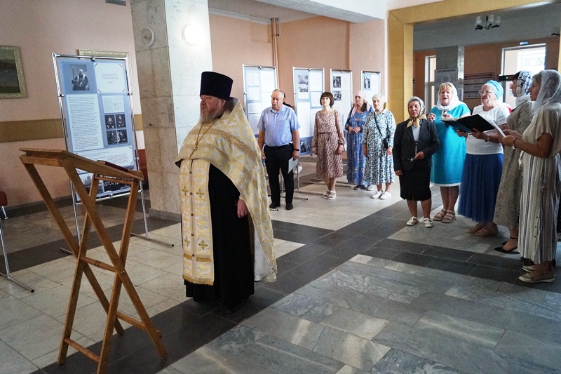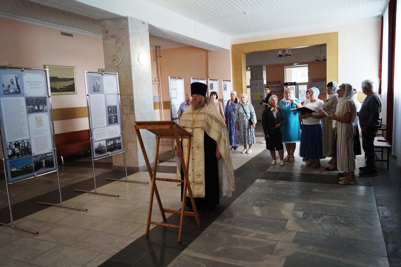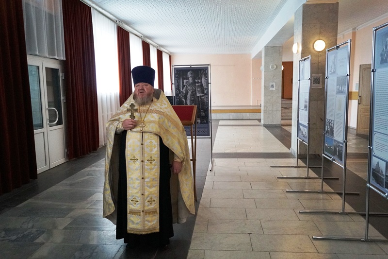 Перед открытием выставки, настоятель храма святителя Митрофана, первого епископа Воронежского села Верхний Мамон, протоиерей Сергий Чибисов совершил молебное пение.