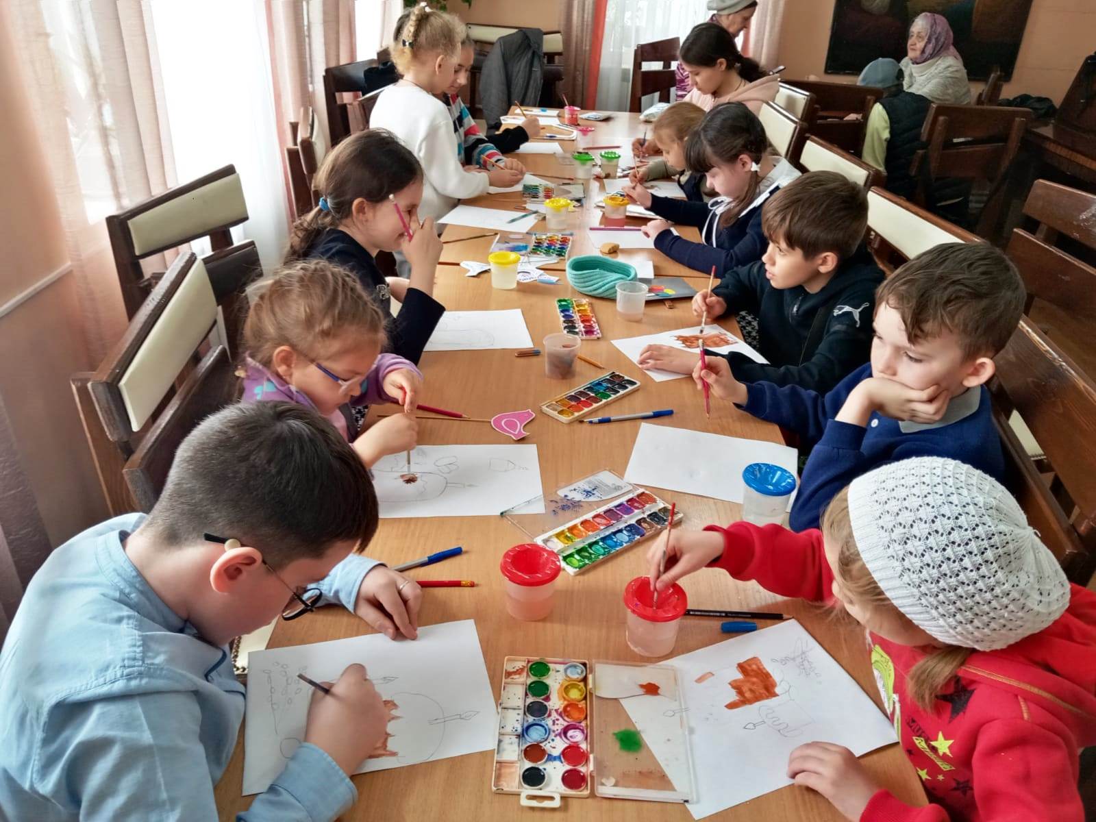 Затем под руководством Олеси Петровны ребята рисовали акварельными красками рисунки под названием «Пасхальная радость». В мастер - классе приняли участие и старшие дети и малыши.