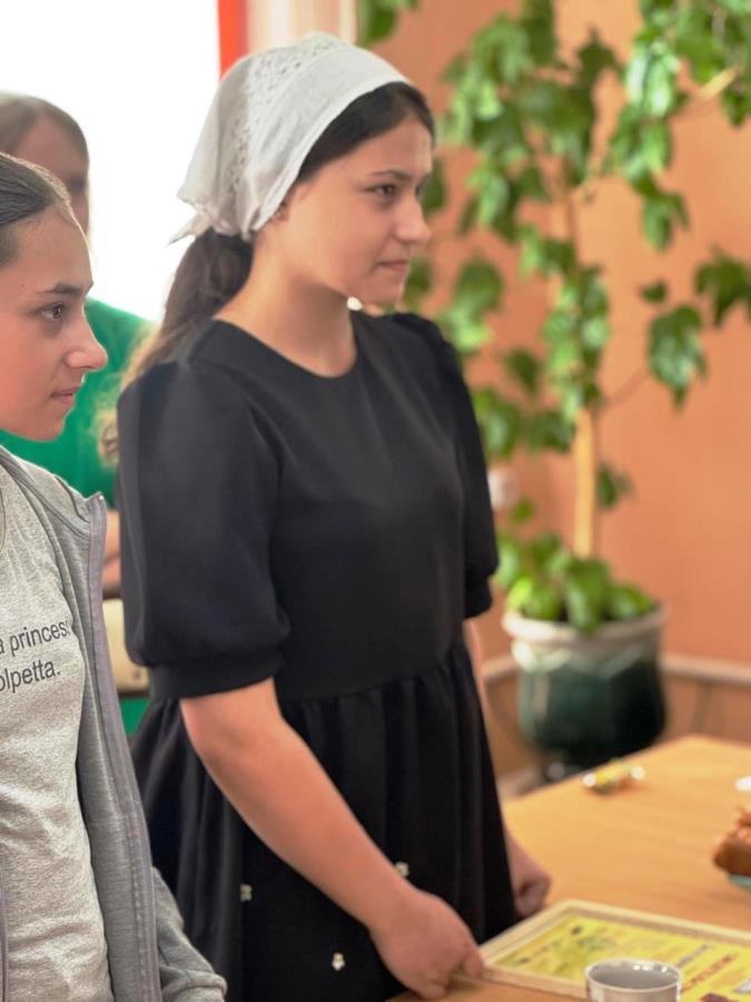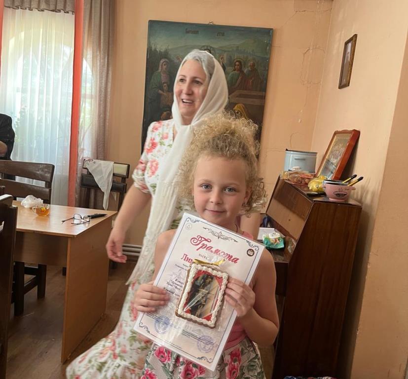 Олеся Петровна и учитель Алевтина Михайловна Шабаева поздравили воспитанницу – выпускницу Белгарову Ульяну, вручили ей свидетельство об окончании воскресной школы и ценные подарки.