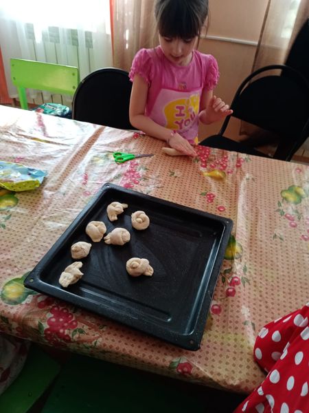 Началось мероприятие с молитвы. Затем ребята под руководством взрослых, лепили из теста птичек, раскладывали их на противень и отправляли выпекаться.