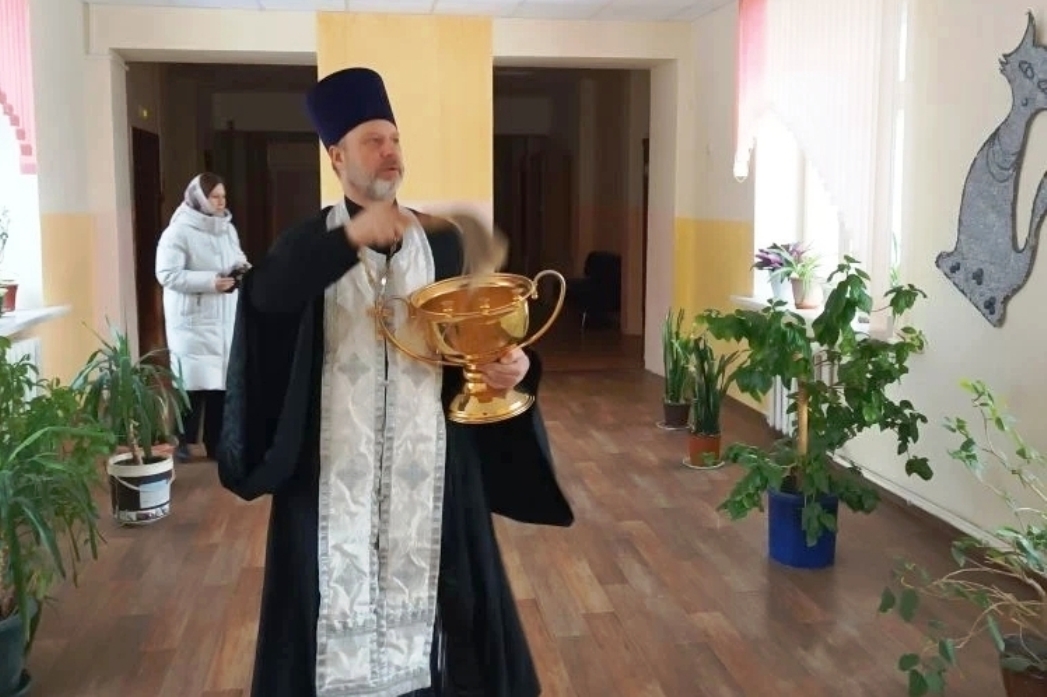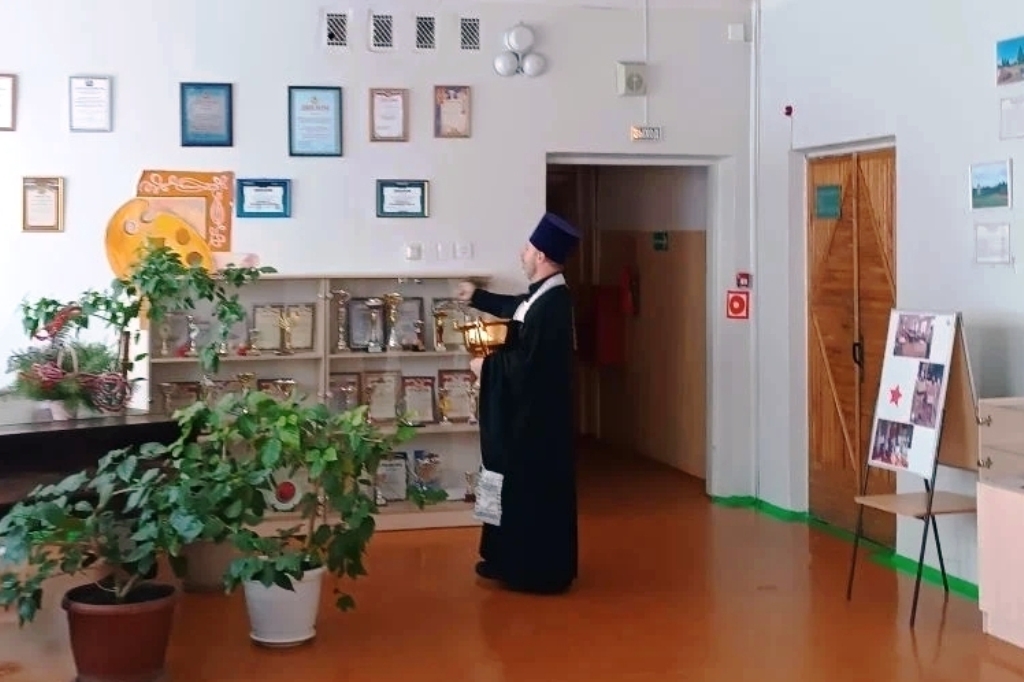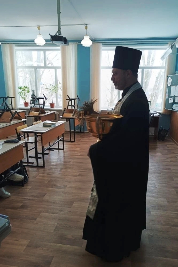 Священнослужитель совершил молебны и при пении тропаря праздника «Во Иордане крещающуся Тебе, Господи...» окропил помещения, учащих и учащихся всех корпусов школ, поздравляя присутствующих с праздником Крещения Господня.