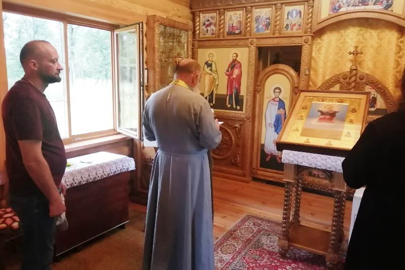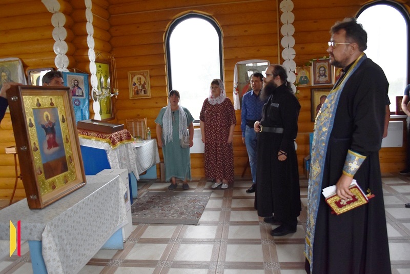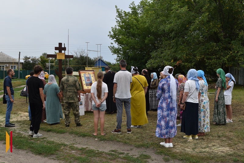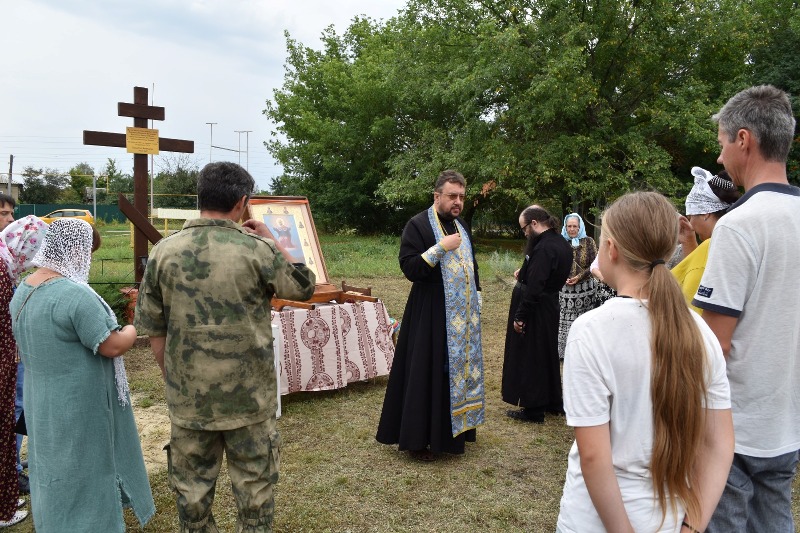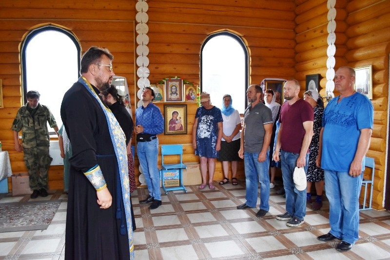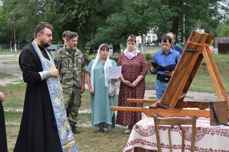 На границе районов духовенство совершило краткий молебен. С напутственным словом к собравшимся обратился иерей Евгений Чайкин, который поблагодарил всех за возможность совместного молитвенного общения и пожелал Божией помощи участникам крестного хода. Приветственное слово также произнёс иерей Дионисий Киреев.