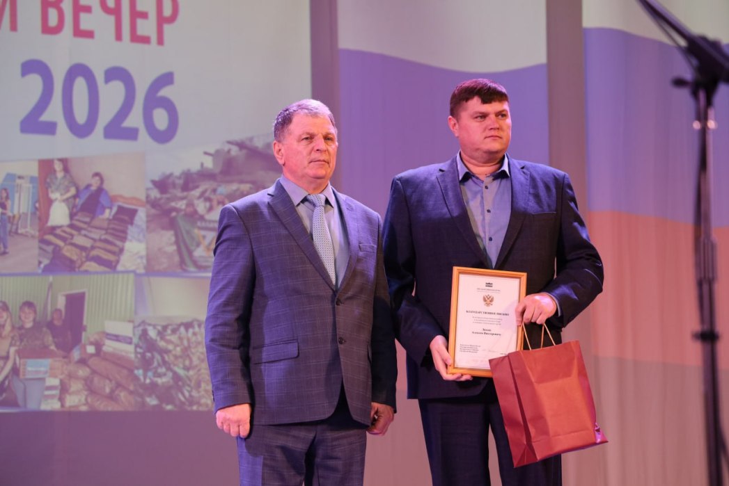 Особое место в программе заняло награждение: на сцене глава администрации Калачеевского района Николай Тимофеевич Котолевский вручил благодарственные письма и памятные подарки (от имени заместителя Председателя Государственной Думы Федерального Собрания РФ А. В. Гордеева) жителям района, внесшим особый вклад в сбор и отправку гуманитарных грузов и за активную общественную деятельность. Награды получили Лисов Алексей Викторович и Разборский Александр Сергеевич.