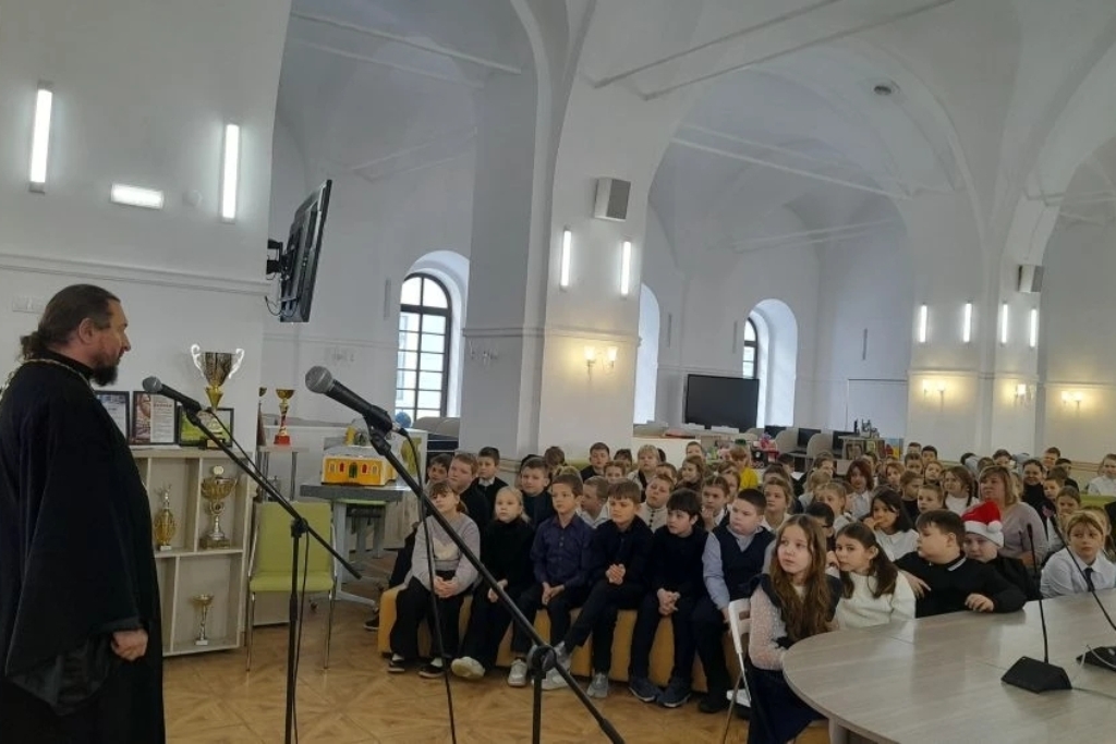 С приветственным словом к преподавателям и учащимся младших классов обратился настоятель храма в честь Успения Пресвятой Богородицы города Калач – священник Димитрий Ткаченко. Он поздравил присутствующих с праздником, подробно рассказал о значении рождения Христа для каждого человека и пожелал ребятам в новом году усердно работать над собой, творить добрые дела, быть послушными и хорошо учиться.