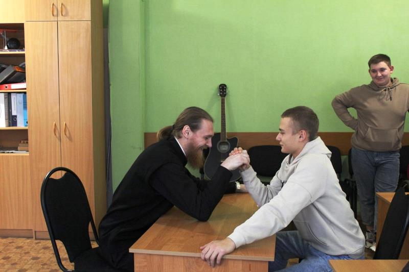 По тематике обсуждаемых вопросов священнослужитель исполнил несколько песен под гитару.