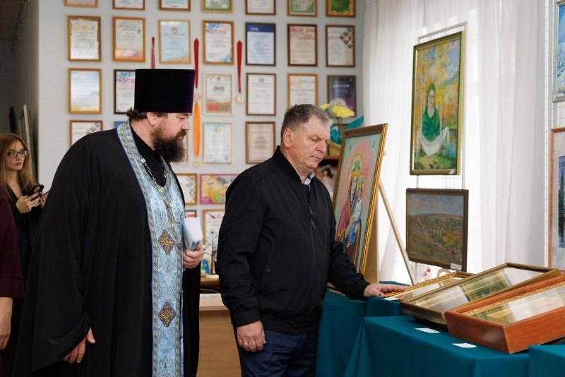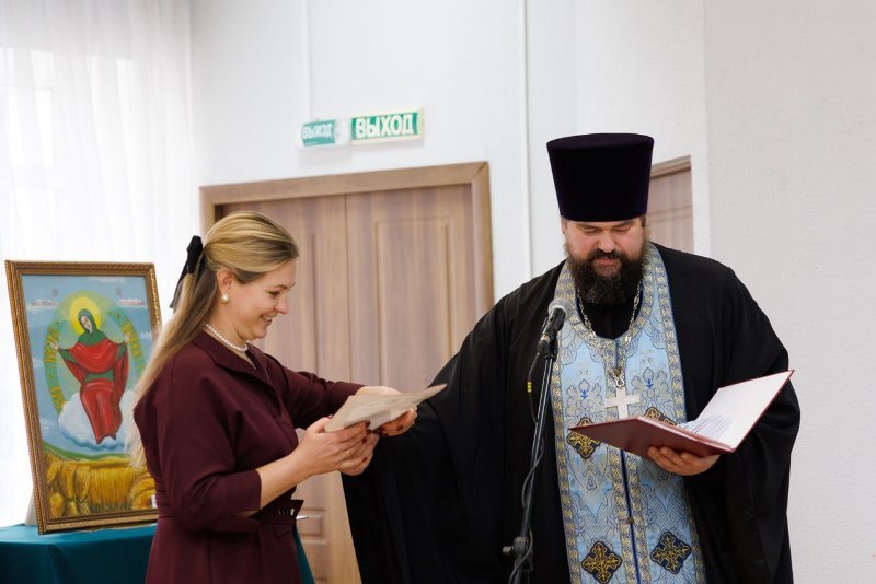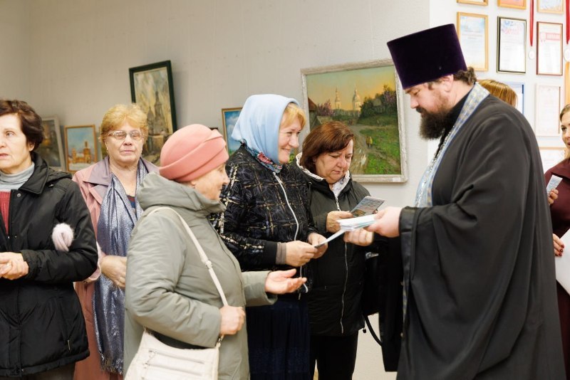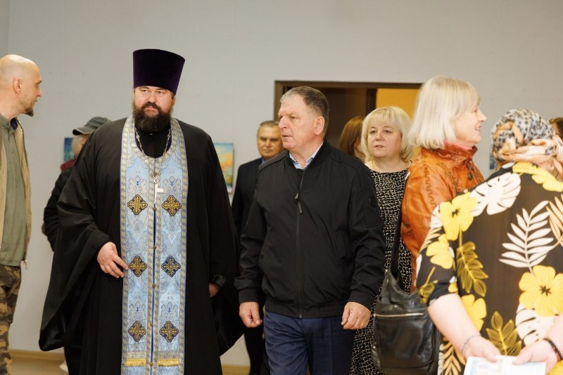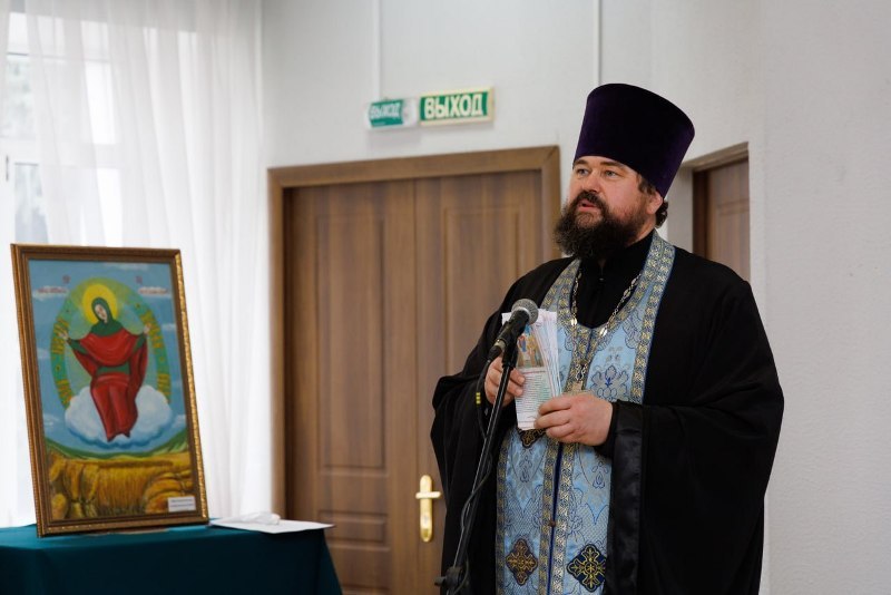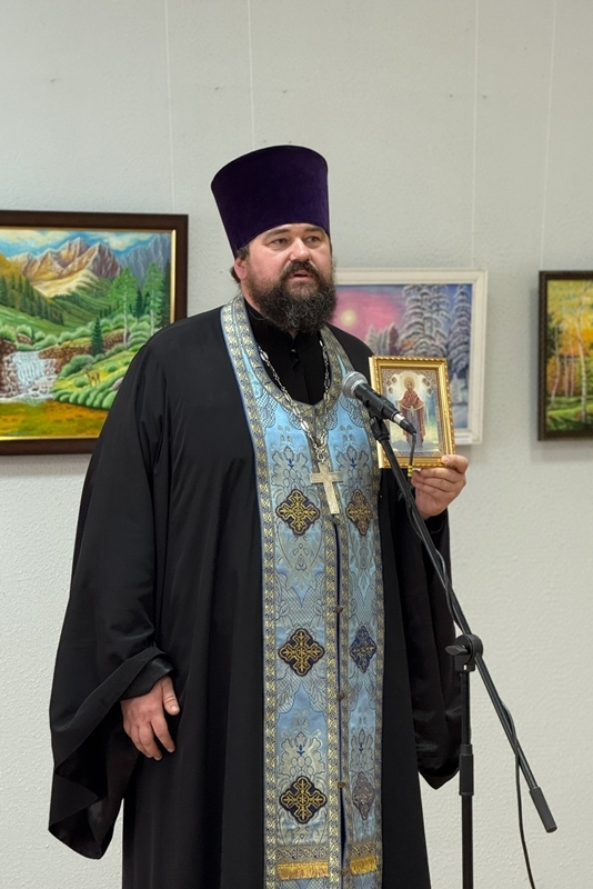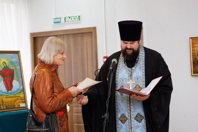 Завершая торжественную часть, благочинный Калачеевского церковного округа протоиерей Евгений Бей обратился ко всем присутствующим с проповедью. В своем слове священнослужитель поздравил всех присутствующих с праздником, поблагодарил творческую интеллигенцию за участие в столь значимом мероприятии и вручил каждому художнику благодарственное письмо, а всем участникам выставки тематические буклеты.