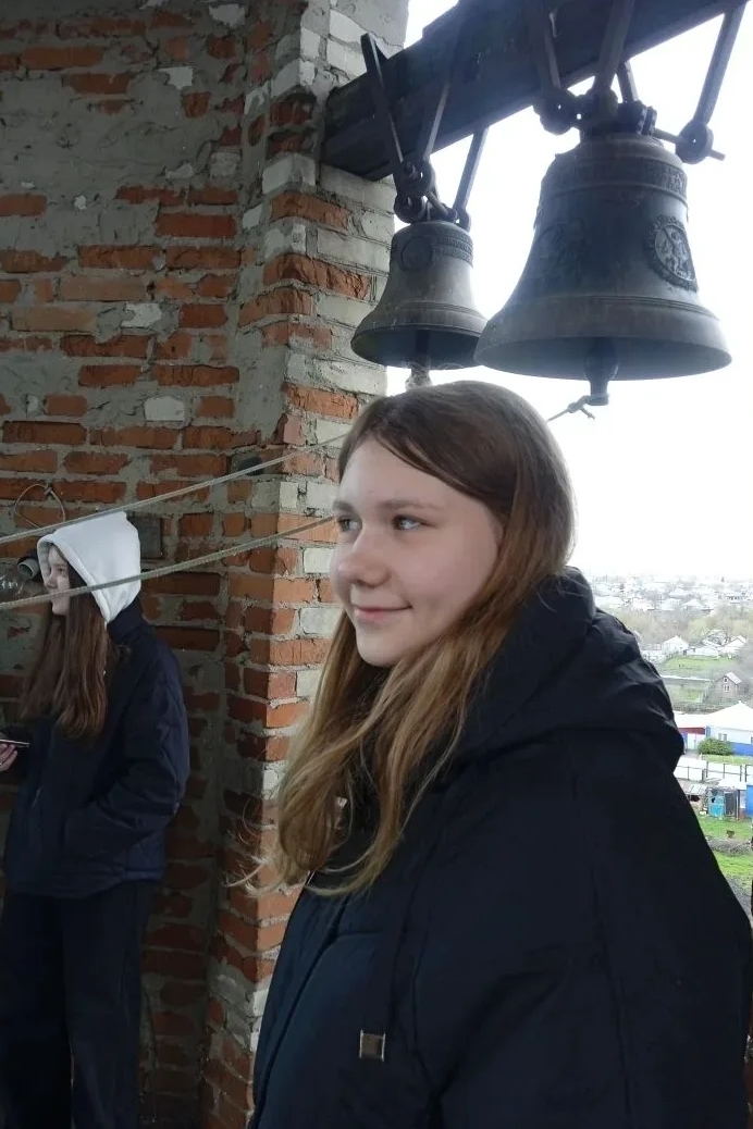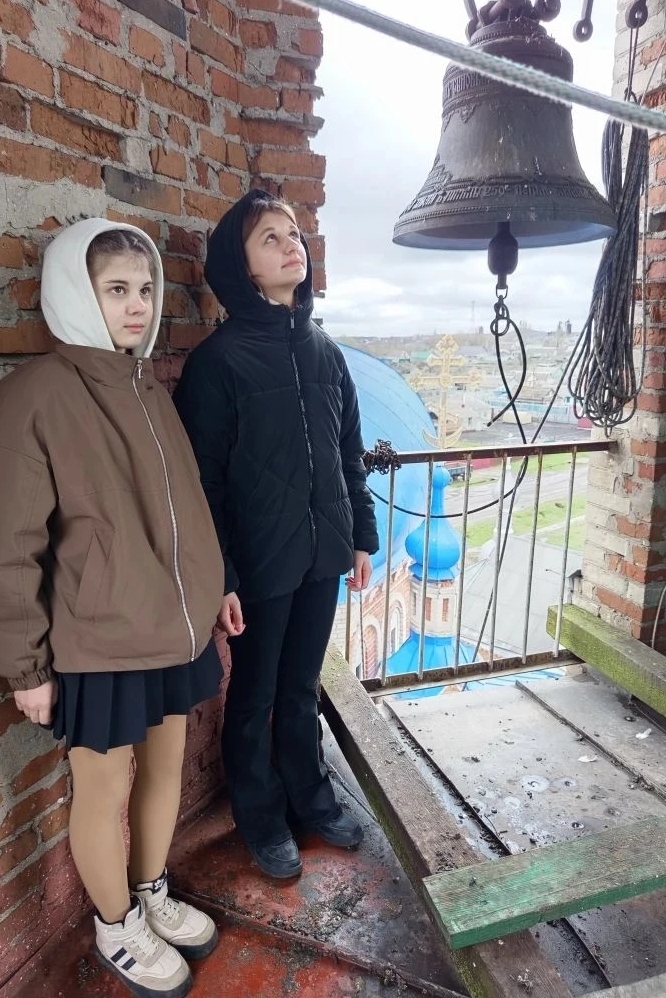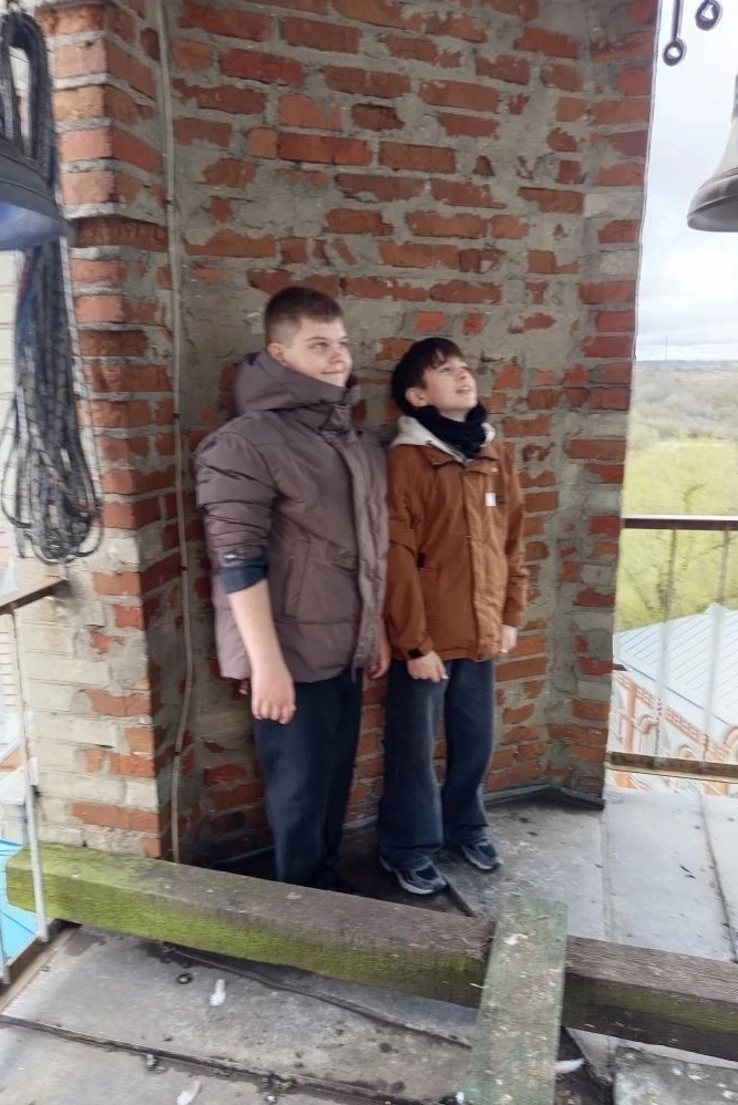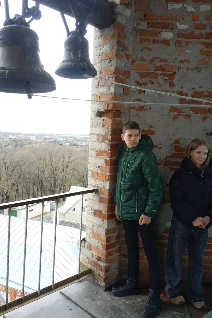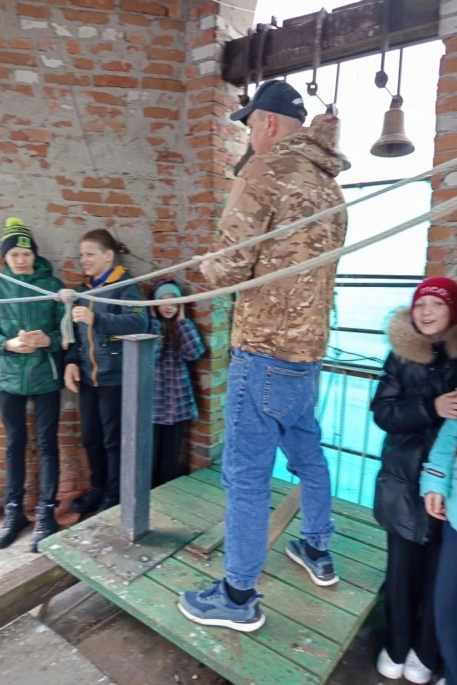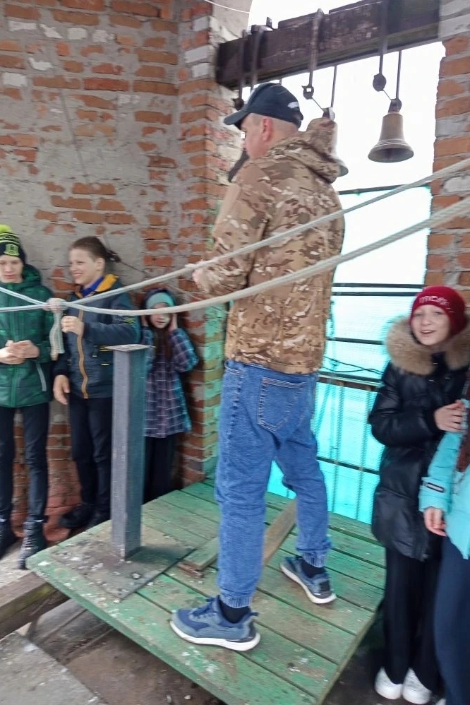 В завершение встречи дети вместе со звонарем Дмитрием Пономаревым поднялись на колокольню: Дмитрий продемонстрировал участникам экскурсии праздничный пасхальный звон, а ребята тоже смогли позвонить в колокола.