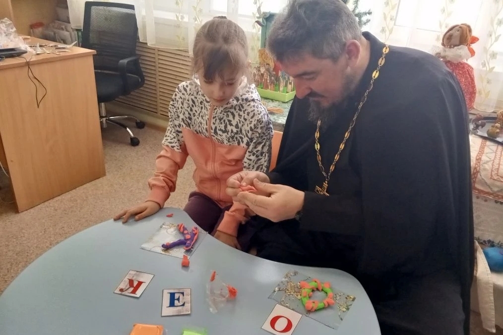 В конце праздника православной культуры батюшка Артемий вместе с воспитанниками детского сада из воздушного пластилина вылепливал буквы алфавита.