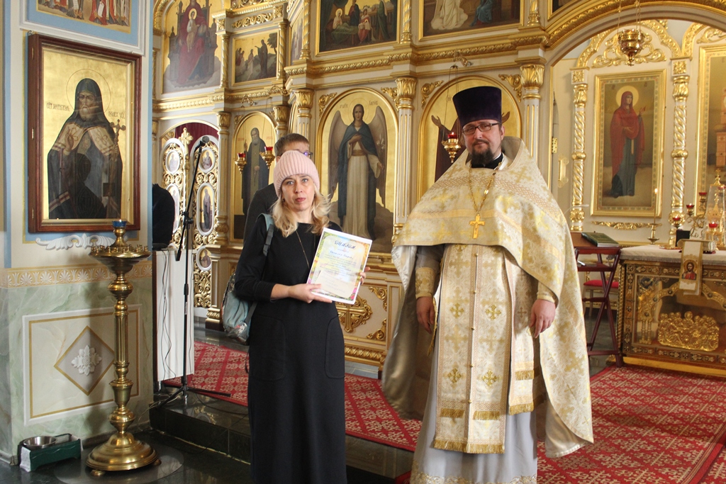 Затем благочинный вручил благодарственные письма представителям образовательных учреждений, победителям и призерам районного этапа Международного конкурса детского творчества «Красота Божьего мира» и конкурса «Рождественская открытка» в рамках епархиального фестиваля «Свет Рождества Христова».