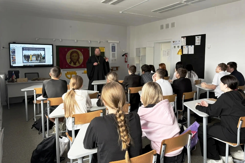 Священнослужитель рассказал учащимся о мужестве и любви к Отечеству, к своей семье и Родине, показал видеоролик о своих поездках в зону проведения специальной военной операции с гуманитарной и духовной миссией, поделился впечатлениями и жизненным опытом.