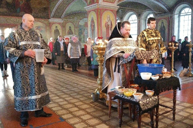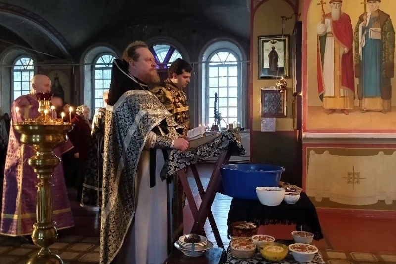 По заамвонной молитве совершалось чинопоследование с чтением канона святому великомученику Феодору Тирону и молитвой на благословение колива – сваренных с медом зерен пшеницы или риса, украшенных фруктами. После окропления святой водой коливо было роздано всем молящимся.