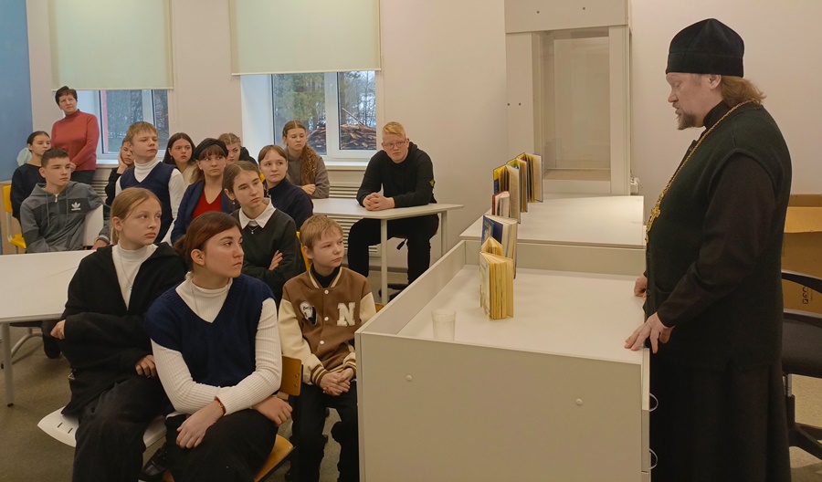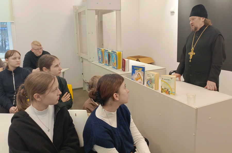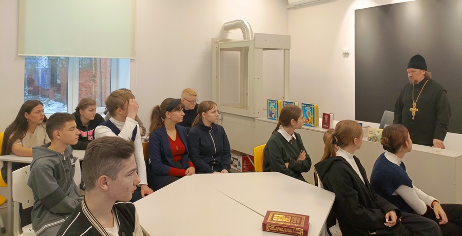 На занятии о. Сергий познакомил ребят с жизнеописанием святителя, о множестве чудес, исходящих по его святым молитвам, о помощи людям.