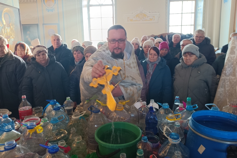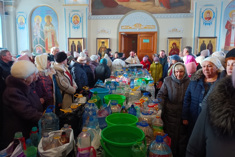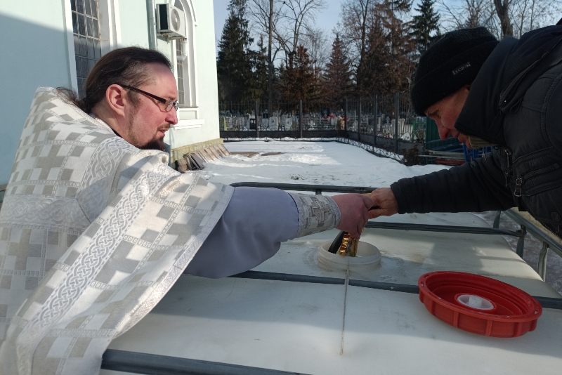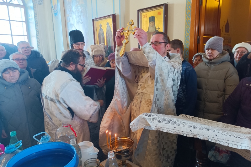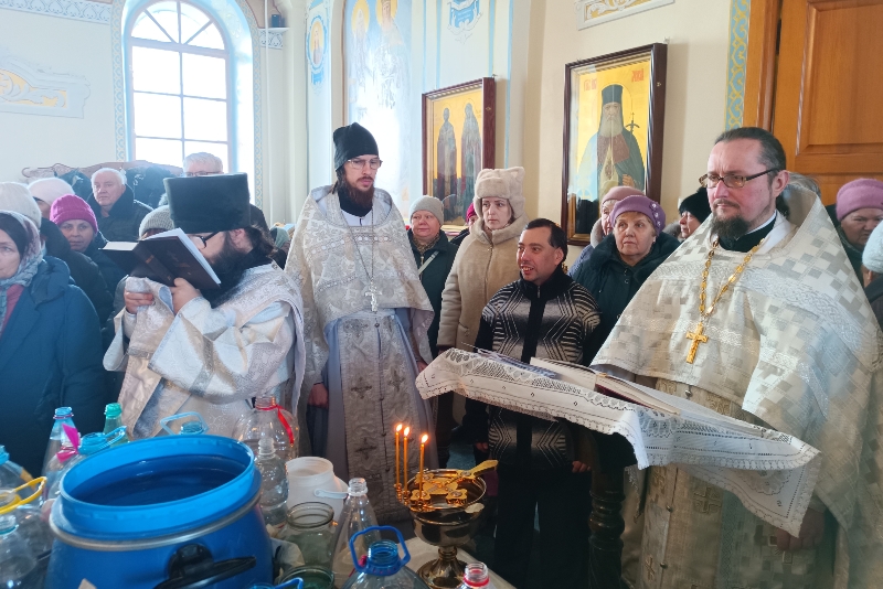 По заамвонной молитве в храме состоялся чин Великого освящения воды. После завершения молитвы, при пении тропаря праздника «Во Иордане крещающуся Тебе, Господи...», иерей Алексий совершил троекратное погружение креста во все водосвятные сосуды, установленные в храме и на территории. Далее освященной водой были окроплены молящиеся и весь храм.