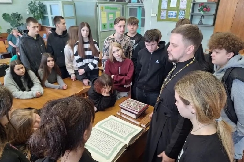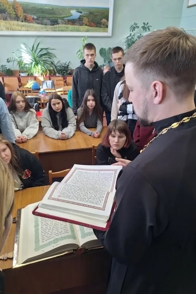 Отец Павел рассказал, почему этот день отмечен в календаре, познакомил ребят с богослужебными книгами. Многие из них впервые взглянули на церковнославянские буквы, попробовали прочесть. Студенты интересовались, почему богослужения в Русской Православной Церкви проходят именно на церковнославянском языке.