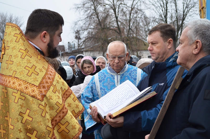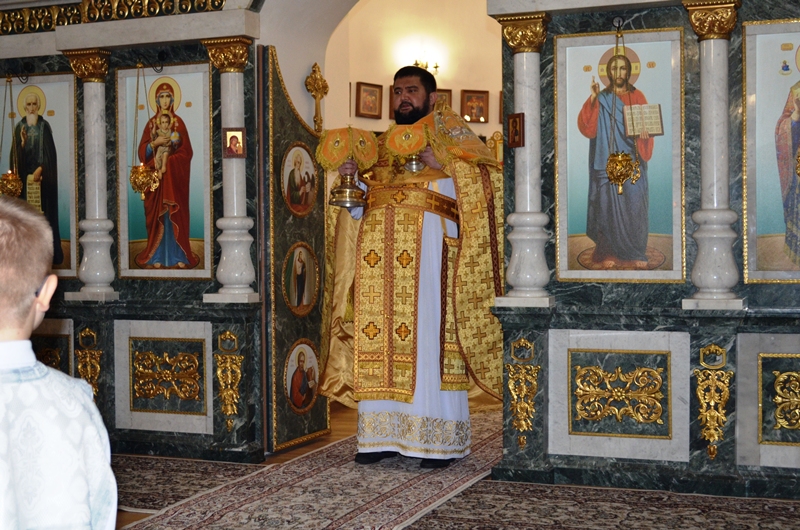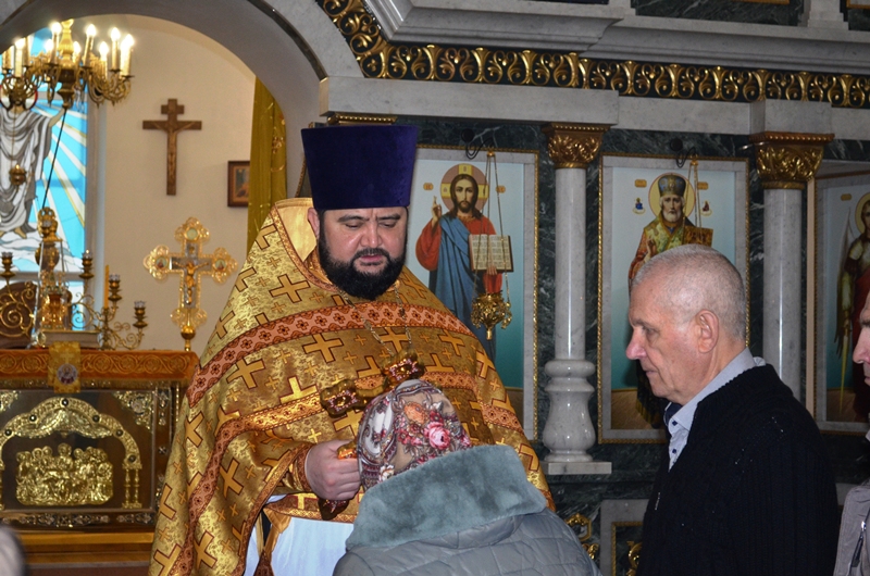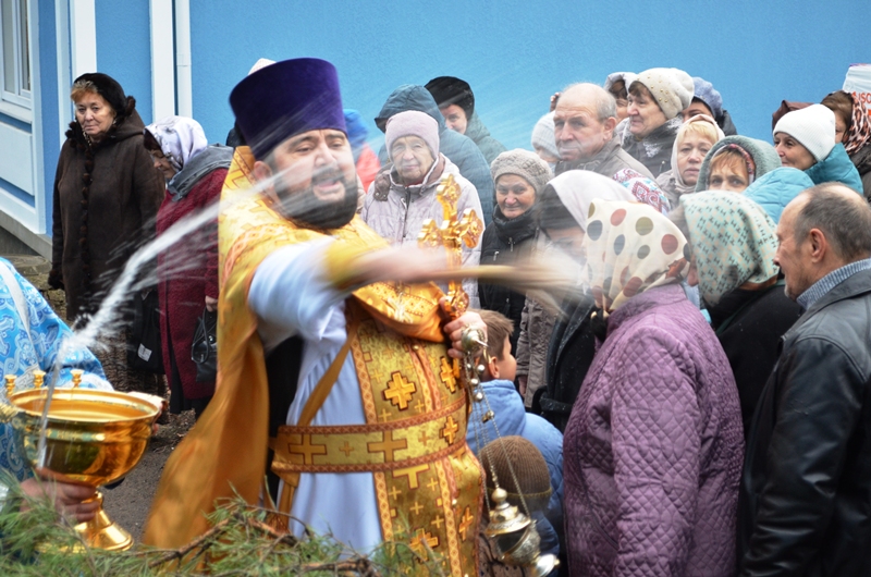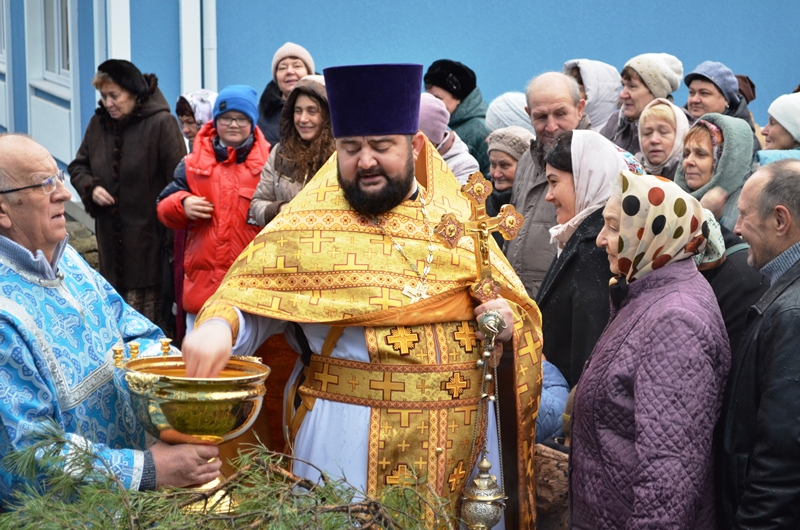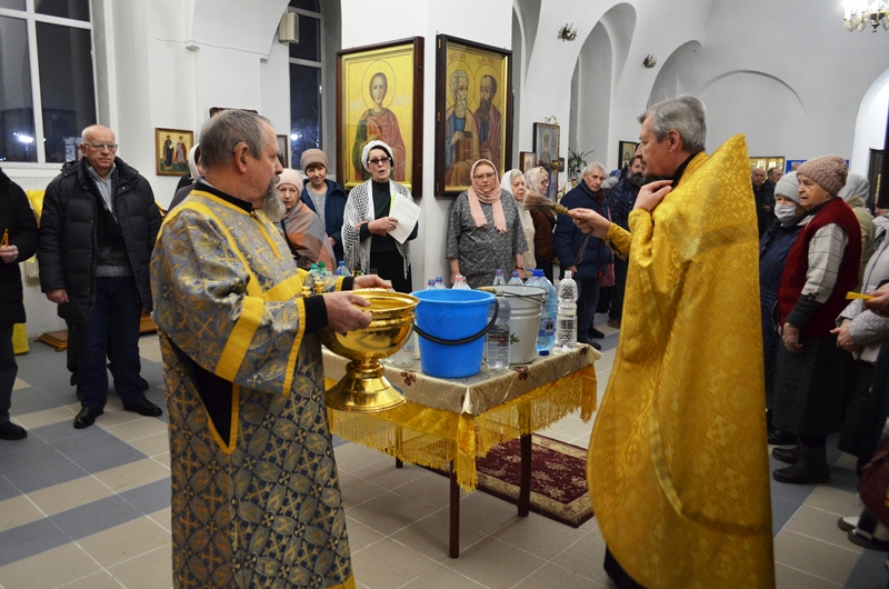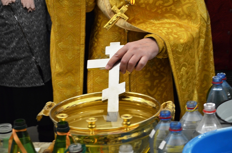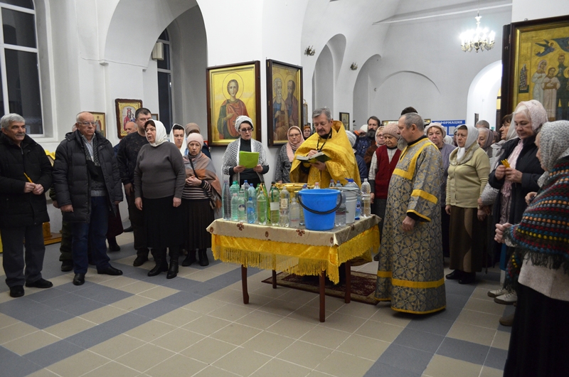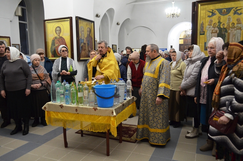 Началось богослужение с водосвятного молебна. Отслужил молебен клирик Казанского храма иеромонах Антоний (Зубов) и окропил прихожан святой водой.