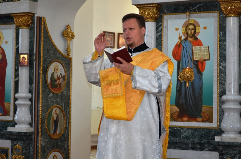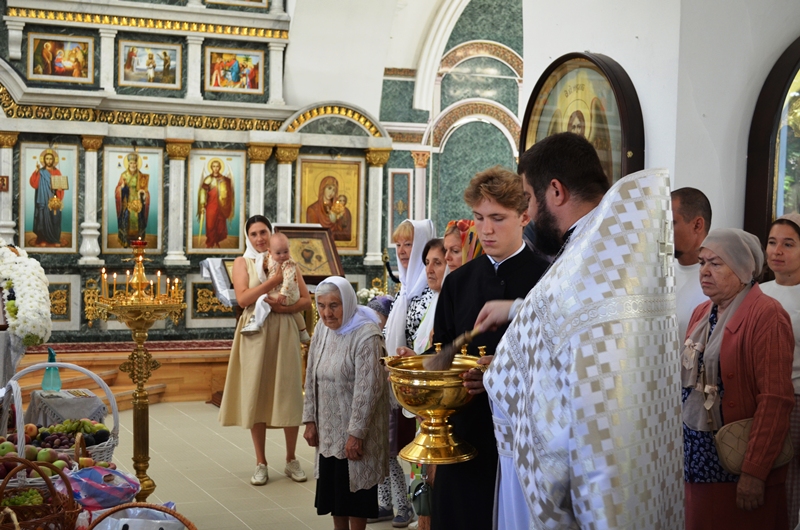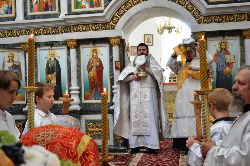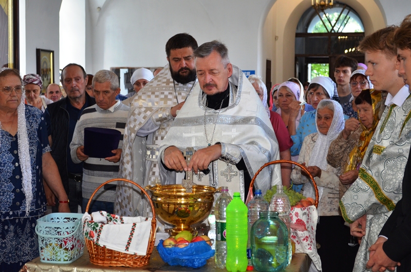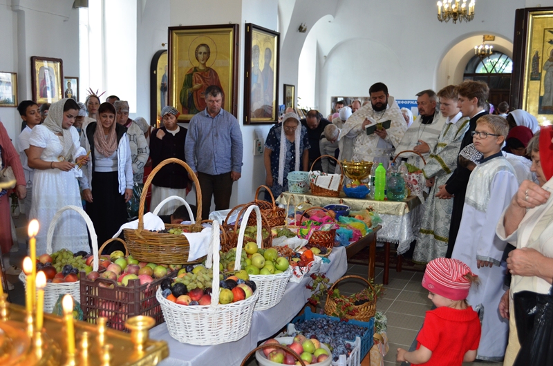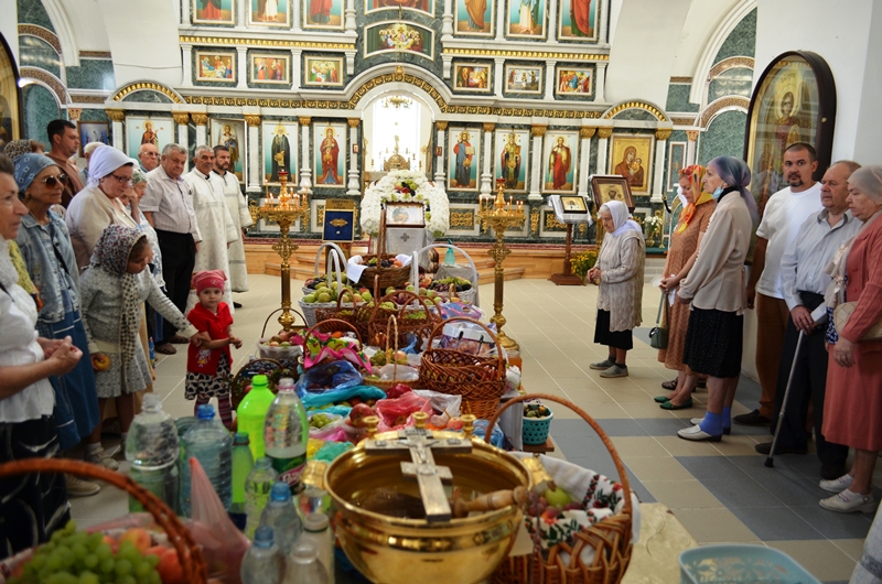 На богослужении было возглашено Евангельское повествование. На сугубой ектении были произнесены прошения о Святой Руси. По запричастном стихе, со словами проповеди о празднуемом событии, к молящимся обратился иерей Максим Богомолов. По заамвонной молитве, на центре храма, было совершено освящение яблок, винограда и других плодов нового урожая.
