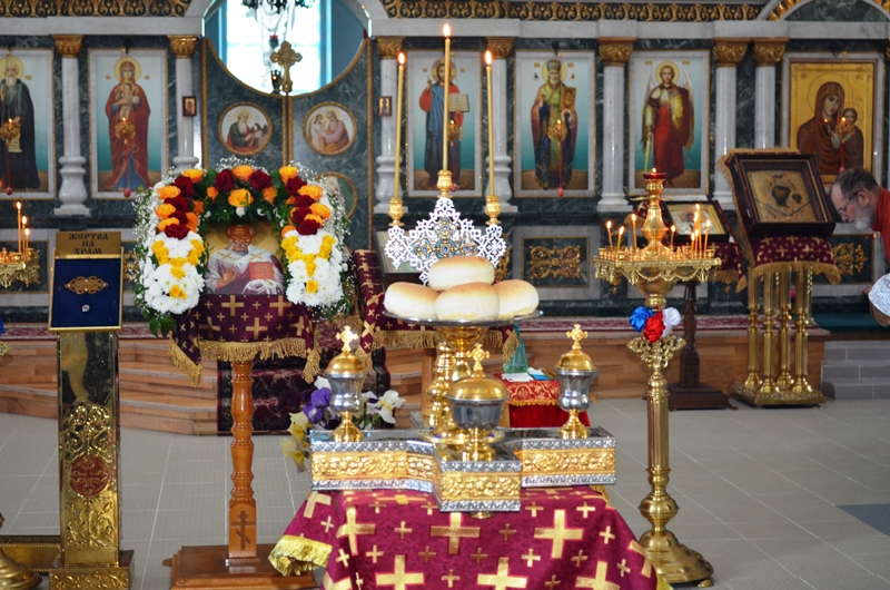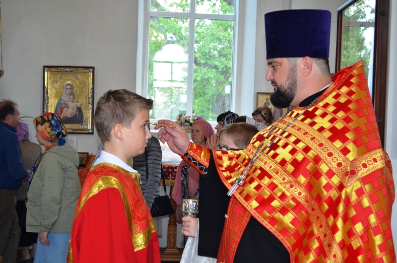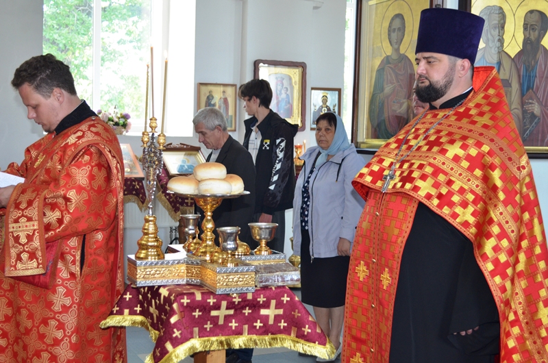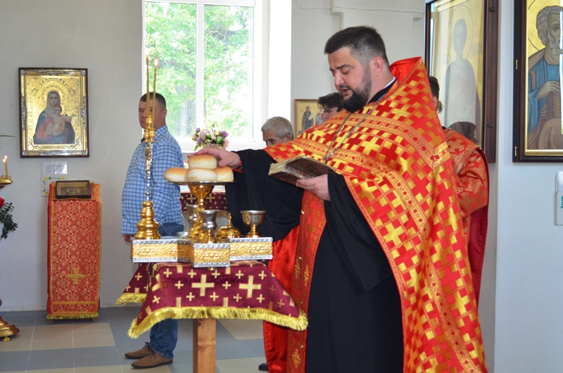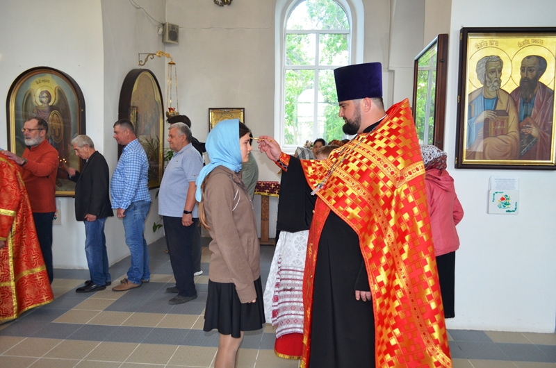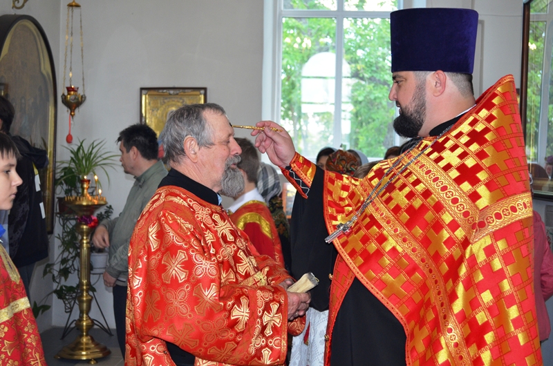 За богослужением была совершена лития с освящением хлеба, вина и елея, а далее отец Максим помазал молящихся освящённым елеем.