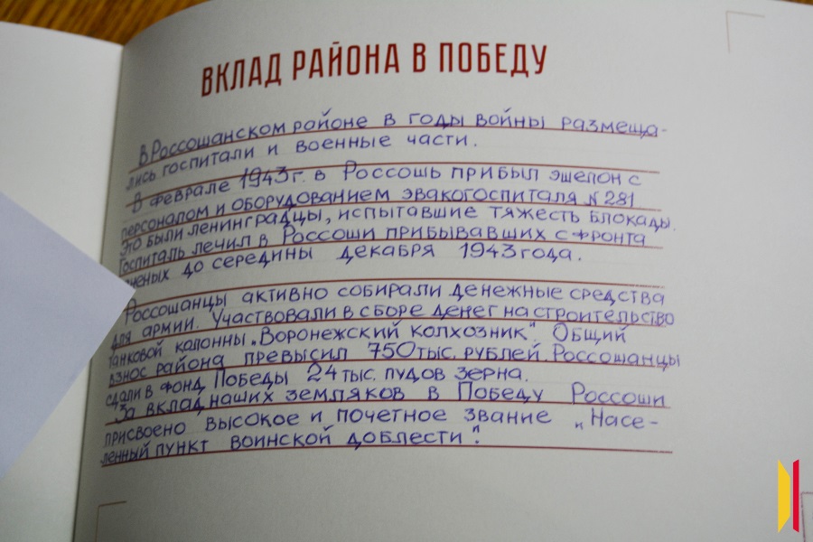 Кроме того, школьники написали послание потомкам и вложили его в капсулу. Символы эстафеты останутся в Россошанском краеведческом музее до 6 мая, после чего будут переданы в Ольховатский район.