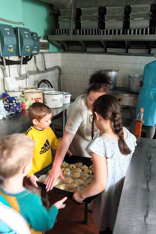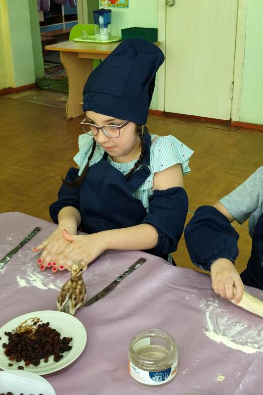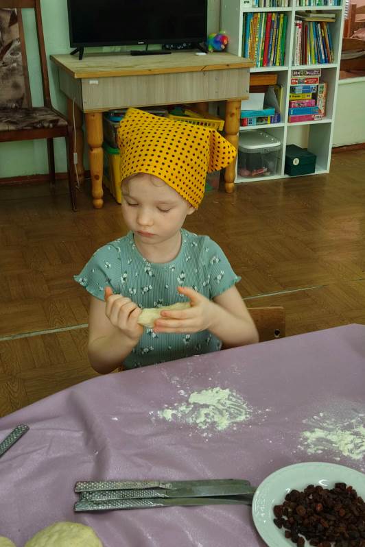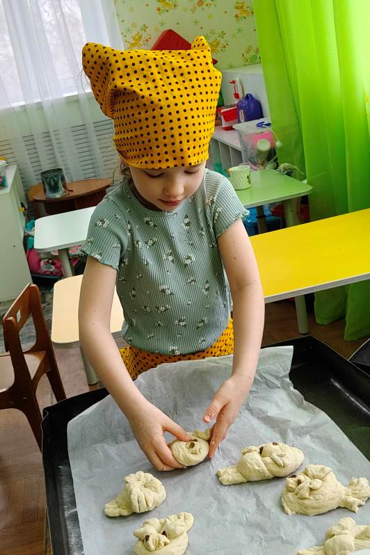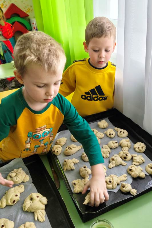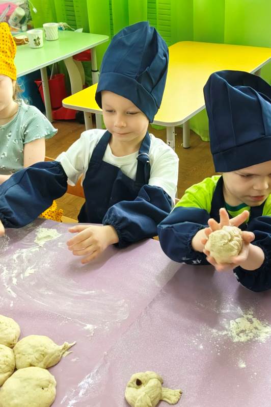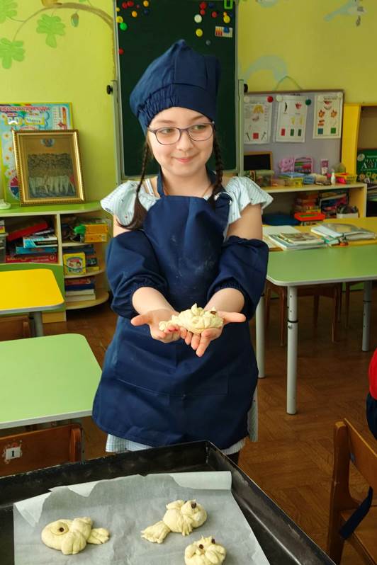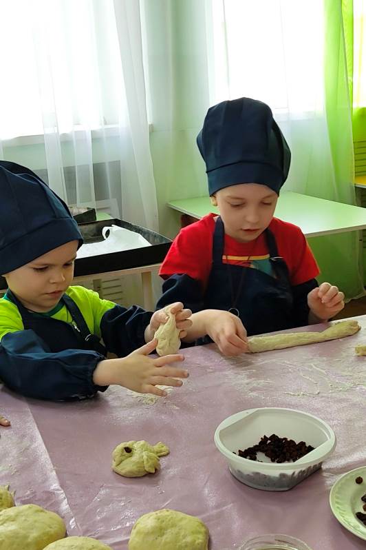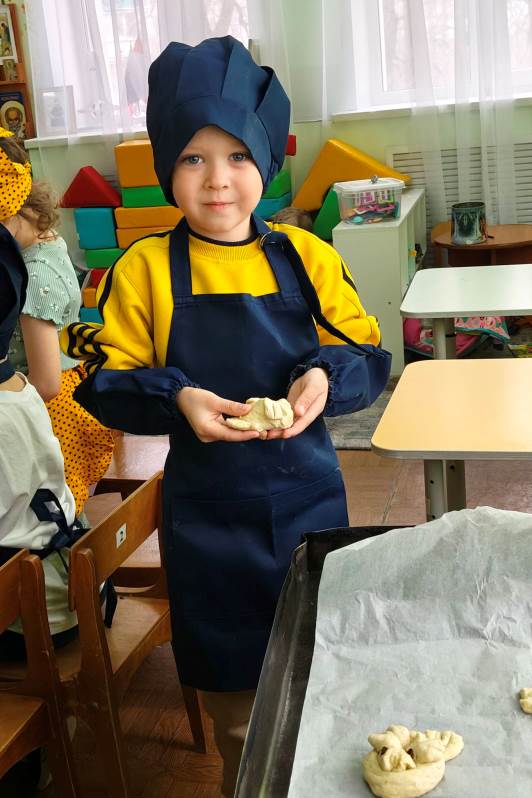 В кулинарной мастерской замесили постное тесто. Оно было простым — без яиц и сливочного масла, — но от этого работа с ним стала только интереснее. Каждый ребенок с большим старанием лепил свою птичку: пальчики малышей превращали кусочки теста в аккуратные головки, расправляли хвостики и крылышки. «Жаворонки» сегодня словно несут к Богу нашу общую благодарность за подвиг воинов и просьбу о мире.