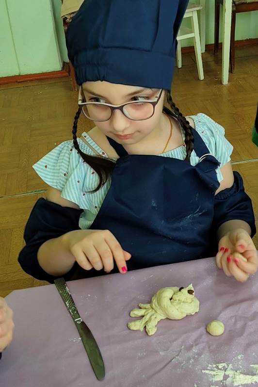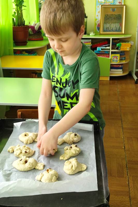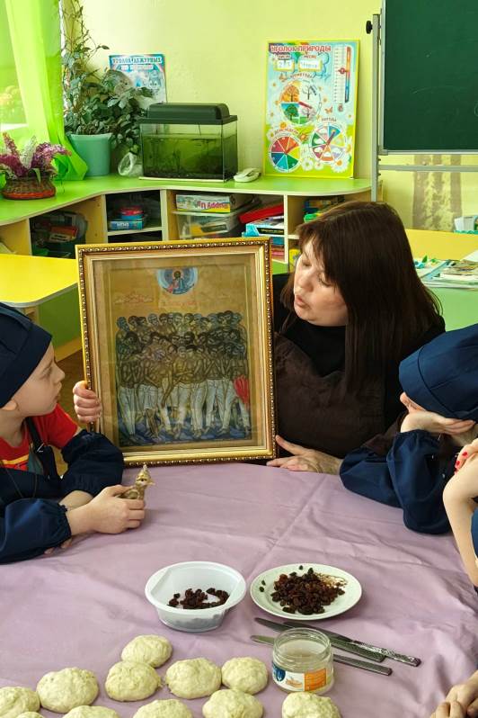 После беседы перешли к кулинарной части занятия. На Руси издавна существует традиция: в день памяти Сорока Севастийских мучеников (22 марта) печь «жаворонков». Считается, что эти маленькие птички своим звонким пением разрывают земные оковы, поднимаются выше туч, устремляются в небо, вознося молитву мучеников к Богу.