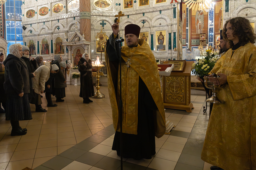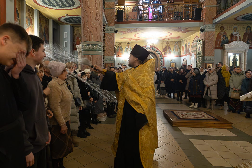 Затем благочинный собора иерей Алексий Кувалдин окропил всех молящихся святой водой и обратился к присутствующим с проповедью. В своем слове священнослужитель поздравил духовенство и прихожан с грядущим новолетием, призвав при этом встретить праздник благочестиво, приняв участие в ночном богослужении, которое возглавит Преосвященнейший Дионисий, епископ Россошанский и Острогожский.