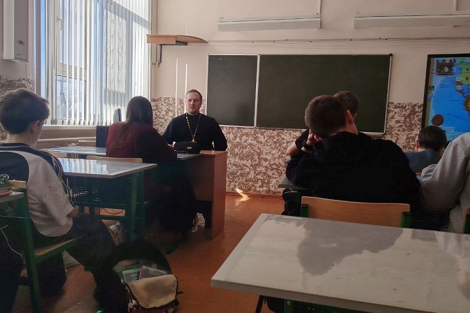 Священнослужитель провел беседу с учениками 7 «Б» класса, темой которой стала масленичная неделя или, как правильно у христиан, Сырная седмица – неделя постепенной подготовки к Великому посту.