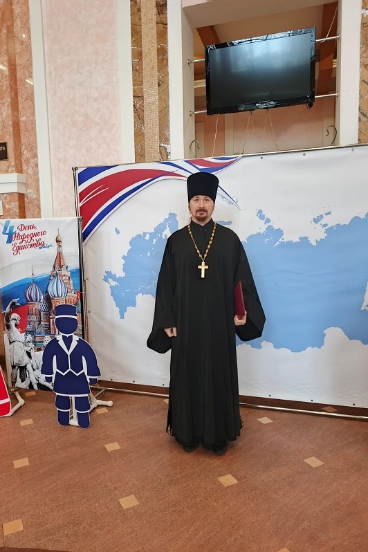 От лица епископа Россошанского и Острогожского Дионисия к гостям мероприятия обратился благочинный Россошанского церковного округа священник Виталий Макаров, который зачитал обращение правящего архиерея по случаю предстоящего Дня народного единства.