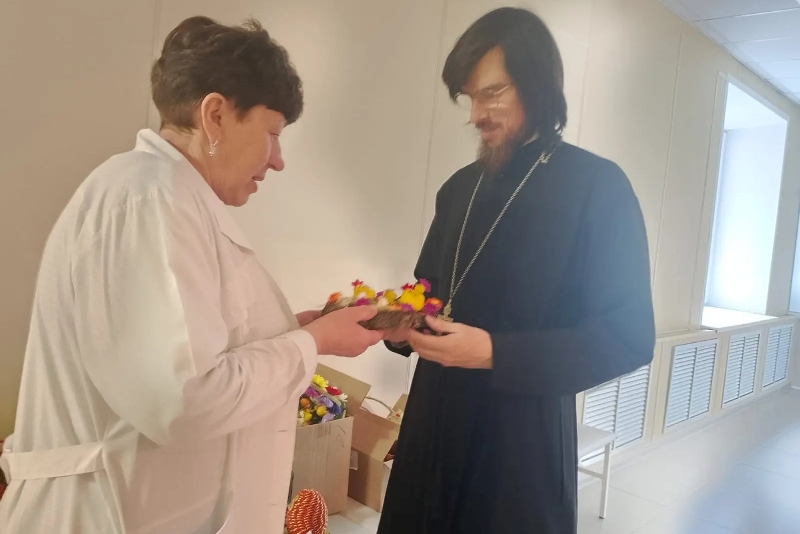 Далее священнослужитель отправился по отделениям учреждения, чтобы поприветствовать каждого словами «Христос Воскресе!» и подарить пасхальные сувениры, изготовленные детьми воскресных школ и общеобразовательных учреждений города.