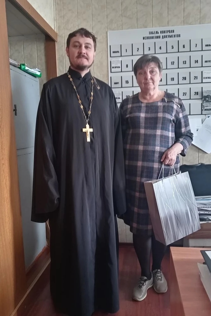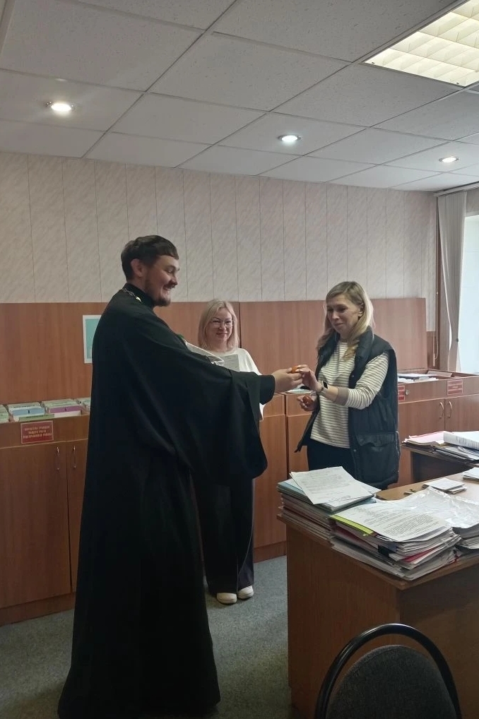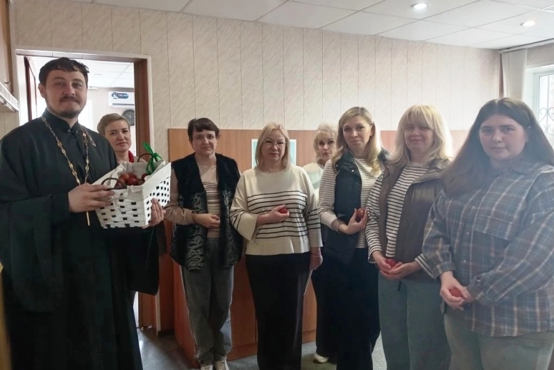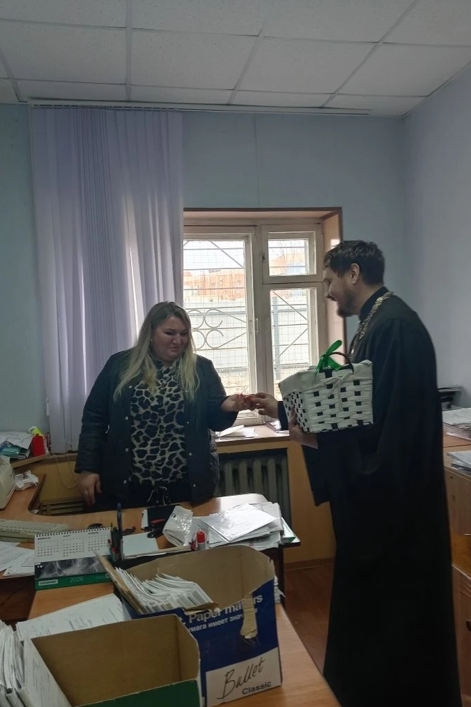 Священнослужитель поздравил сотрудников комиссариата с праздником Святой Пасхи, подарил освященные куличи и яйца, а также передал пасхальный подарок зам. начальнику комиссариата Молдовановой Елене Викторовне.