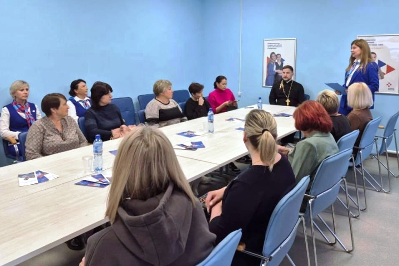 На встречу были приглашены женщины, ищущие работу, а также члены семей участников СВО. По их просьбе на мероприятие пришёл священник, иерей Павел Белов, который является настоятелем храма апостола Павла в городе Павловск и помощником благочинного по миссионерской работе.