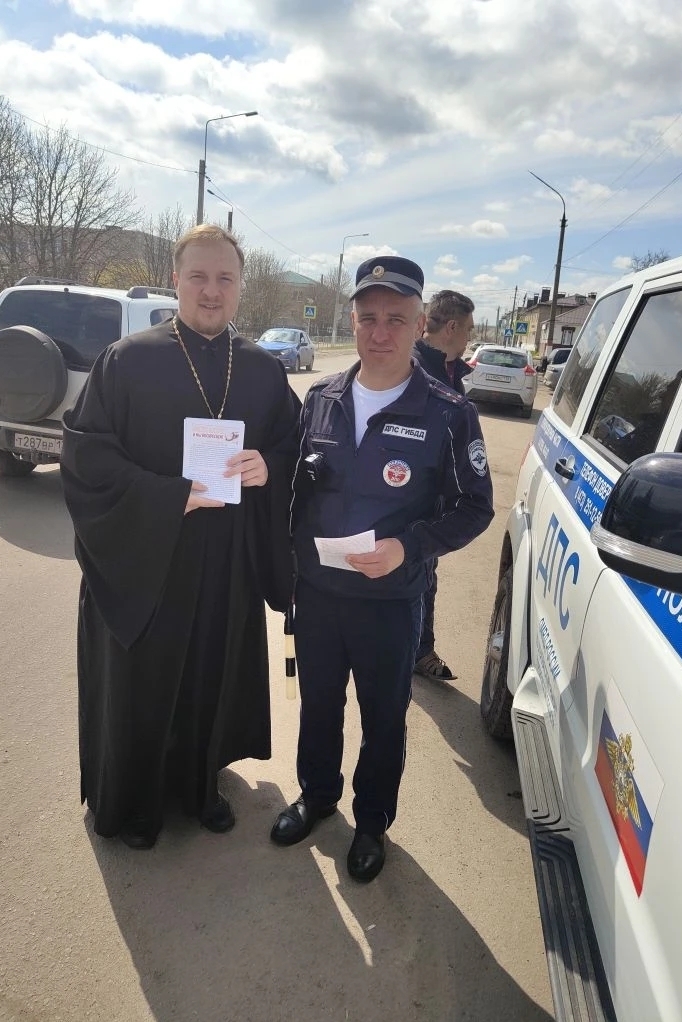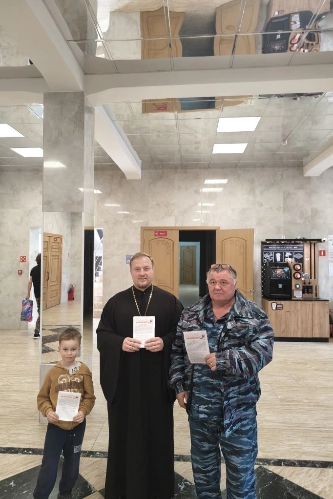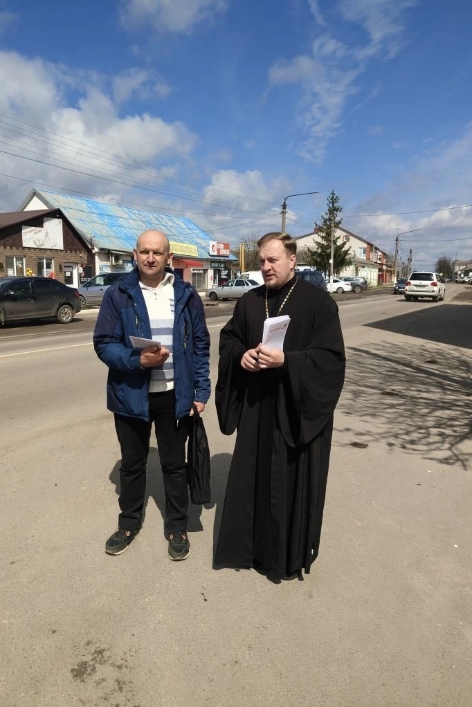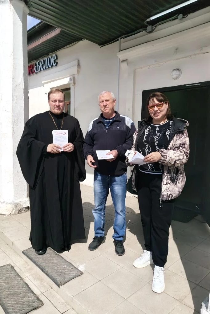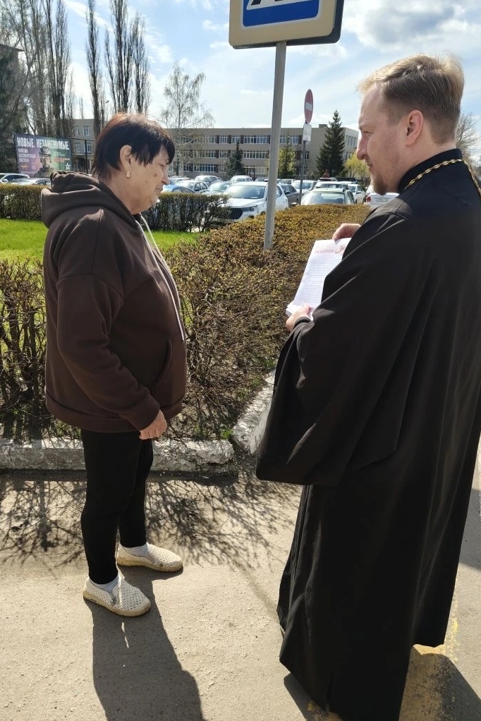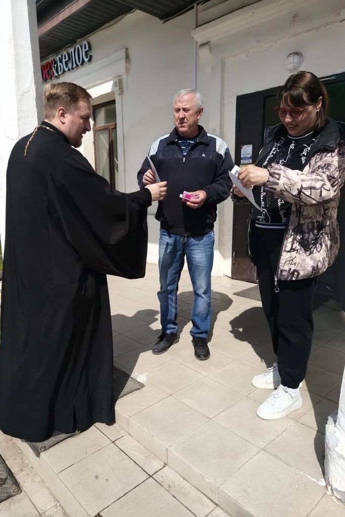 Вручая буклет, священнослужитель рассказывал о значении праздника Воскресения Христова и всех приглашал в Преображенский храм на богослужение и беседы, которые традиционно проходят по воскресным дням.